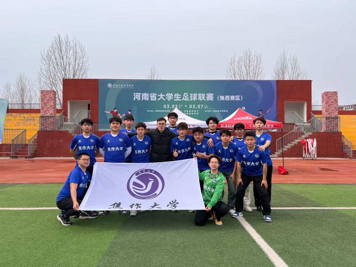 2025年3月5日,首届河南省大学生足球联赛(豫西赛区)小组赛收官战在洛阳科技职业学院太极运动场打响。由我校足球协会牵头组建的男子足球队凭借顽强意志与出色发挥,以2:0完胜河南林业职业学院,成功锁定小组出线权。此役不仅是一场胜利,更见证了校队两大传奇的诞生——队长马兴鹏刷新校队历史出场纪录;前锋汪宇轩独中两元,加冕校队历史最佳射手。