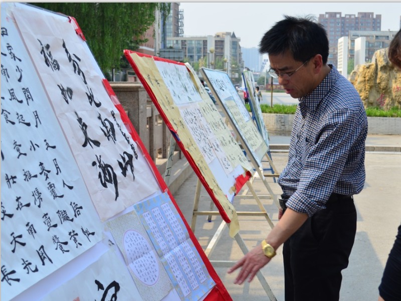 4月30日下午,由千人行书法协会承办的校科技文化艺术节之书法比赛作品展在南校区崇学楼举办。书法协会辅导老师冯泉明在现场指导并做点评。